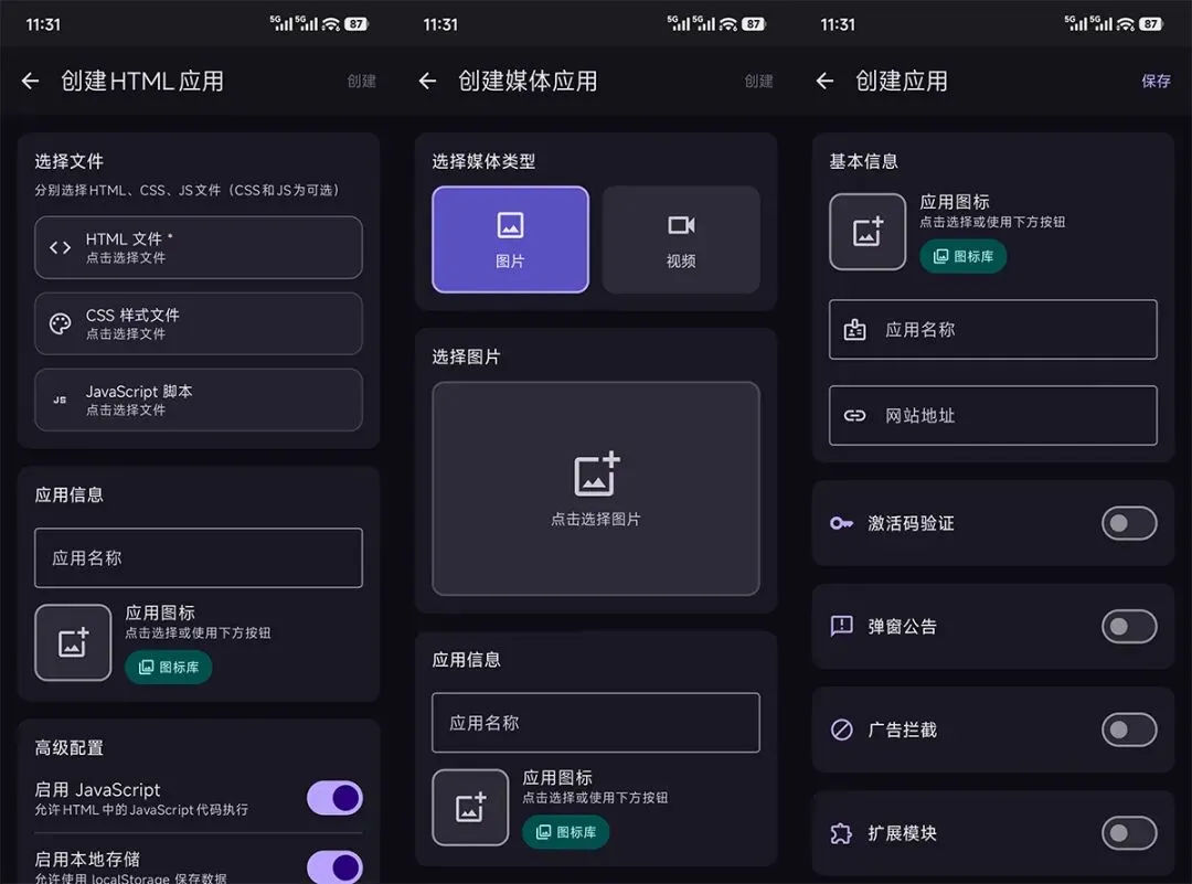 提供了三种转化成 APK 应用的功能,包括有:网站转App(输入任意网址,生成独立 WebView 应用);媒体转App(图片/视频一键转换为全屏展示应用);HTML转App( HTML/CSS/JS 项目转换为独立应用)。