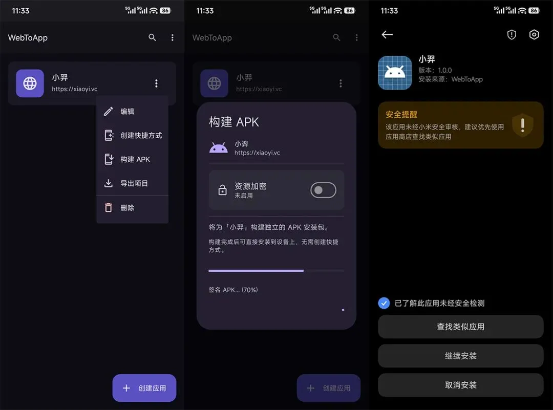 一键生成独立应用,支持前端项目快速打包成 Android 应用、企业内部系统快速 App 化、游戏/工具类 H5 应用独立封装、给已安装应用换个喜欢的图标等。