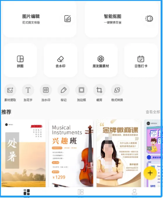 用它做海报效率很高,简单调整几下就能出效果。基础功能里,P 图、去水印、抠图、拼图这些都有,连朋友圈早安卡这类场景化素材也能直接做,操作不复杂。内置的模板库很丰富,节日海报、简历模板之类的直接搜就能找到,而且可以自由修改素材、替换文字,没有使用限制。