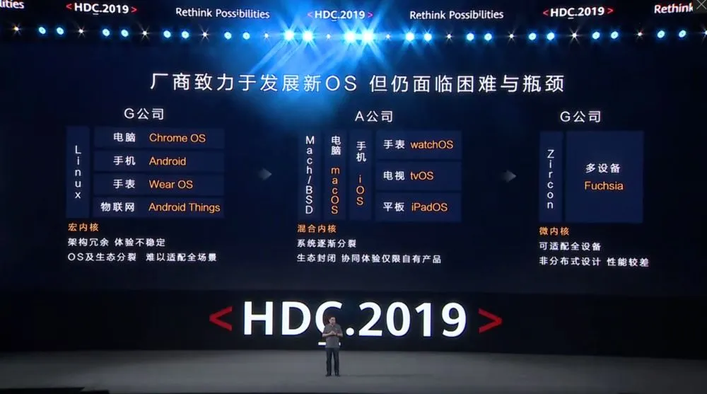 “大量智能终端出现,未来万物互联,我们是不是为每一种硬件开发OS呢?这样工作量非常巨大,生态协同工作也是很复杂。不同设备是割裂的。如何让工作效率更高,打破设备之间的墙,实现生态共享,跨终端实现,这是对我们OS提出的要求。如何打造面向未来的OS?今天我们带来了华为的鸿蒙OS。”