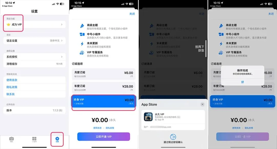 2,内购界面,选择 终身VIP¥0.00 选项,点击底部按钮进行购买。
