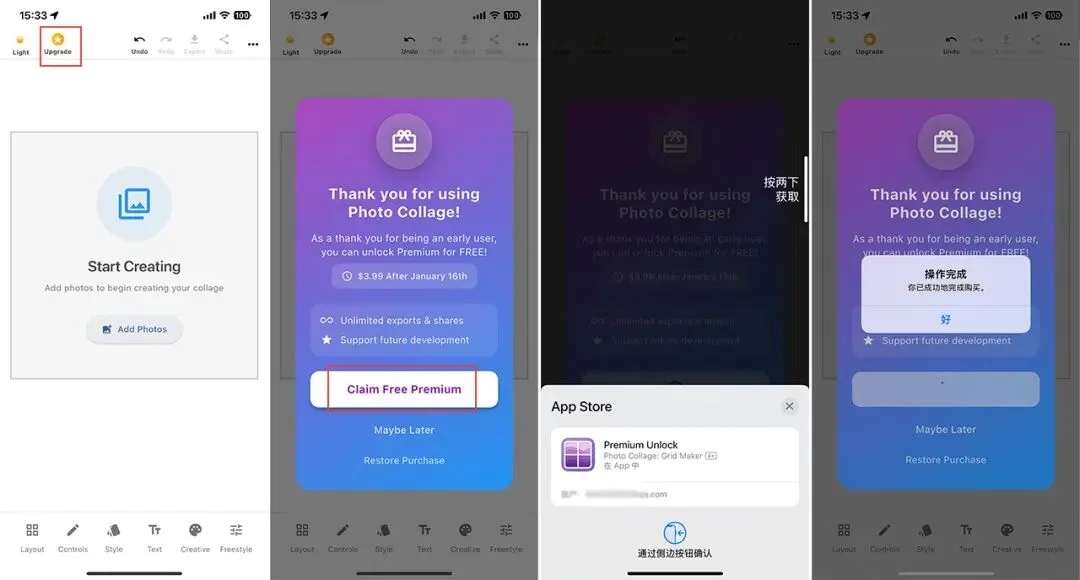 1,打开 App,按引导一步步继续进入主界面,点击左上方 upgrade 选项,进入内购页面。2,内购界面,确认页面显示价格为免费,点击下方按钮进行购买。