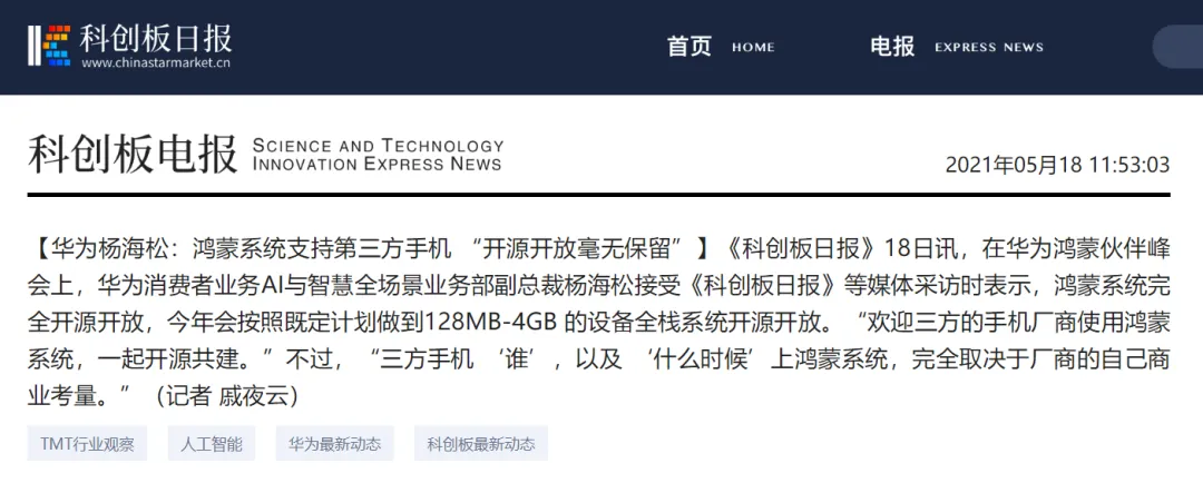 同时,《科创板日报》的报道显示,鸿蒙系统完全开源开放,今年会按照既定计划做到128MB-4GB 的设备全栈系统开源开放。