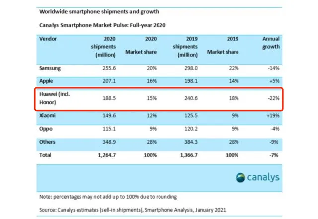 据调研机构canalys数据显示,2020年华为手机(含荣耀)出货量1.885亿部,市场占有率15%,排名第三。华为在2019年以2.4亿部的手机出货量击败苹果,位列第二。