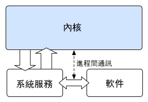 微核心的设计理念,是将系统服务的实现,与系统的基本操作规则区分开来。它实现的方式,是将核心功能模块化,划分成几个独立的行程,各自运行,这些行程被称为服务。所有的服务行程,都运行在不同的地址空间。只有需要绝对特权的行程,才能在具特权的运行模式下运行,其余的行程则在用户空间运行。