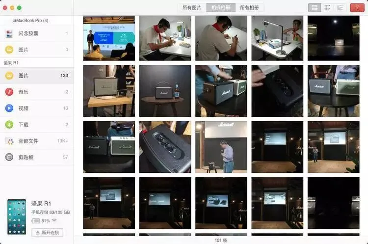 和 Android File Transfer 相比,HandShaker 的整个界面要美观许多,图片、音乐等文件的分类管理也比较符合我们的使用习惯。当然 HandShaker 也给自家产品预留了更多功能,如果你使用坚果手机可以实现自动同步、同步闪念胶囊等功能。