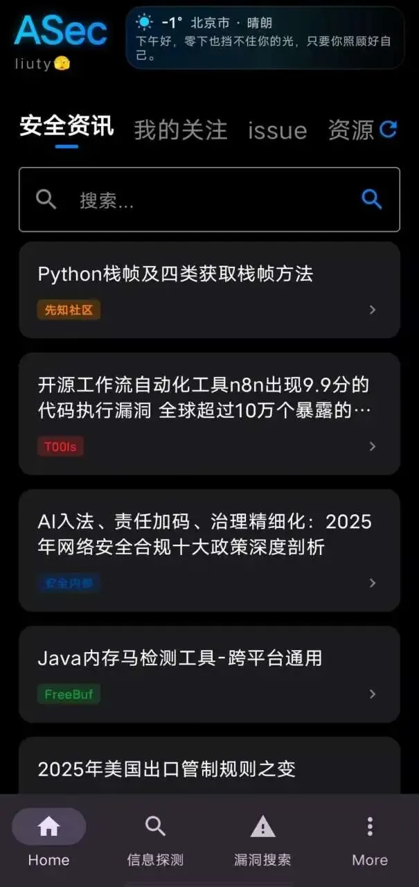 ASec的安全资讯模块直接整合了FreeBuf、先知社区、奇安信攻防社区、看雪论坛、火线Zone等国内顶尖安全社区内容,通勤、摸鱼时随手一刷,就能掌握行业最新动态、技术文章与漏洞预警,无需在多个APP间来回切换。