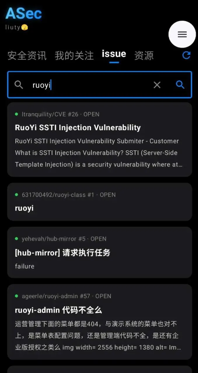 对于专注开源项目安全的研究员来说,Issue模块堪称刚需。ASec可直接查询GitHub上的项目Issue,像RuoYi框架的SSTI注入漏洞、项目代码完整性问题等,都能在这里快速定位,助力提前感知开源项目的安全风险,为漏洞挖掘和代码审计抢占先机。