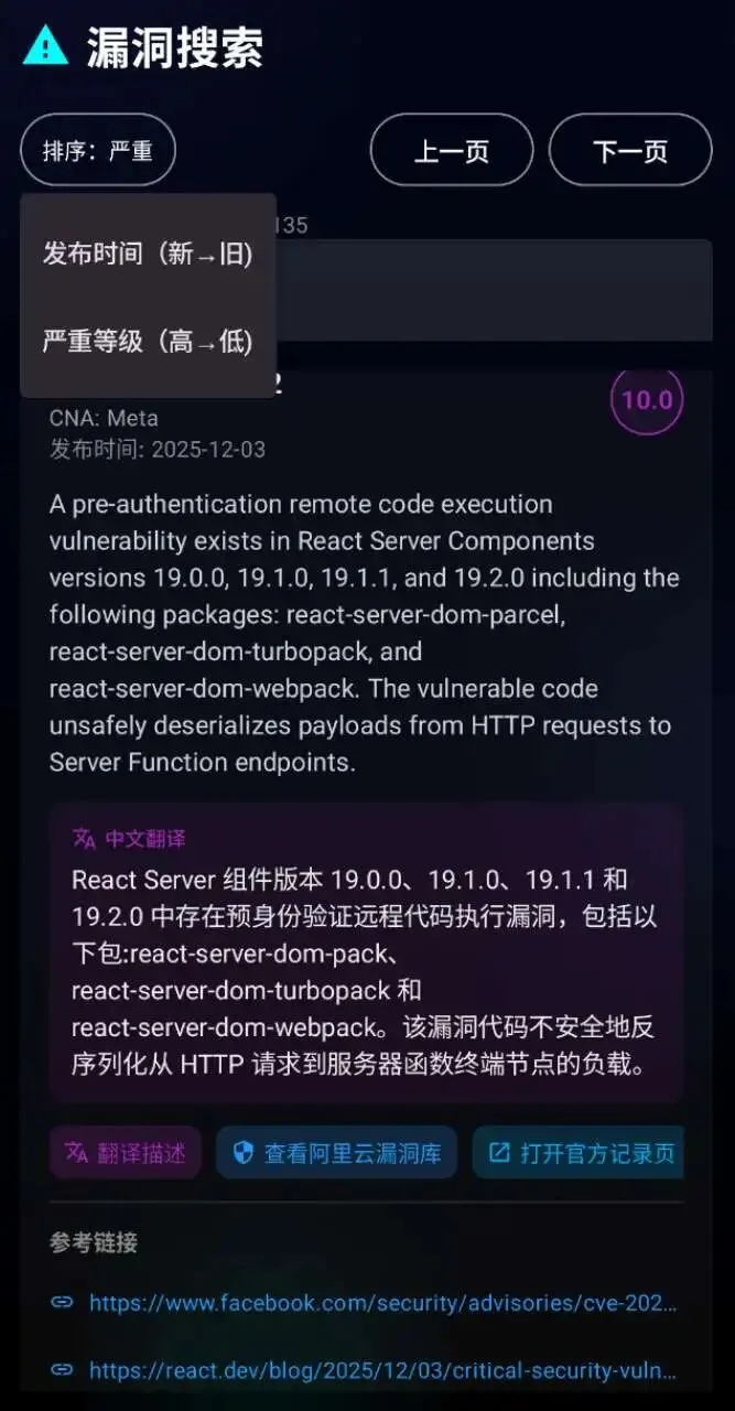 漏洞搜索模块更是亮点十足:支持中英文混合查询(如“若依/RuoYi”),可按时间、严重程度排序,搭配一键翻译功能,跨语言漏洞检索无压力;漏洞预警、每日新增漏洞模块接入墨菲安全OSCS开源数据,实时同步最新高危漏洞,PoC公开信息、漏洞影响范围等关键内容直观展示,助力快速响应漏洞风险。