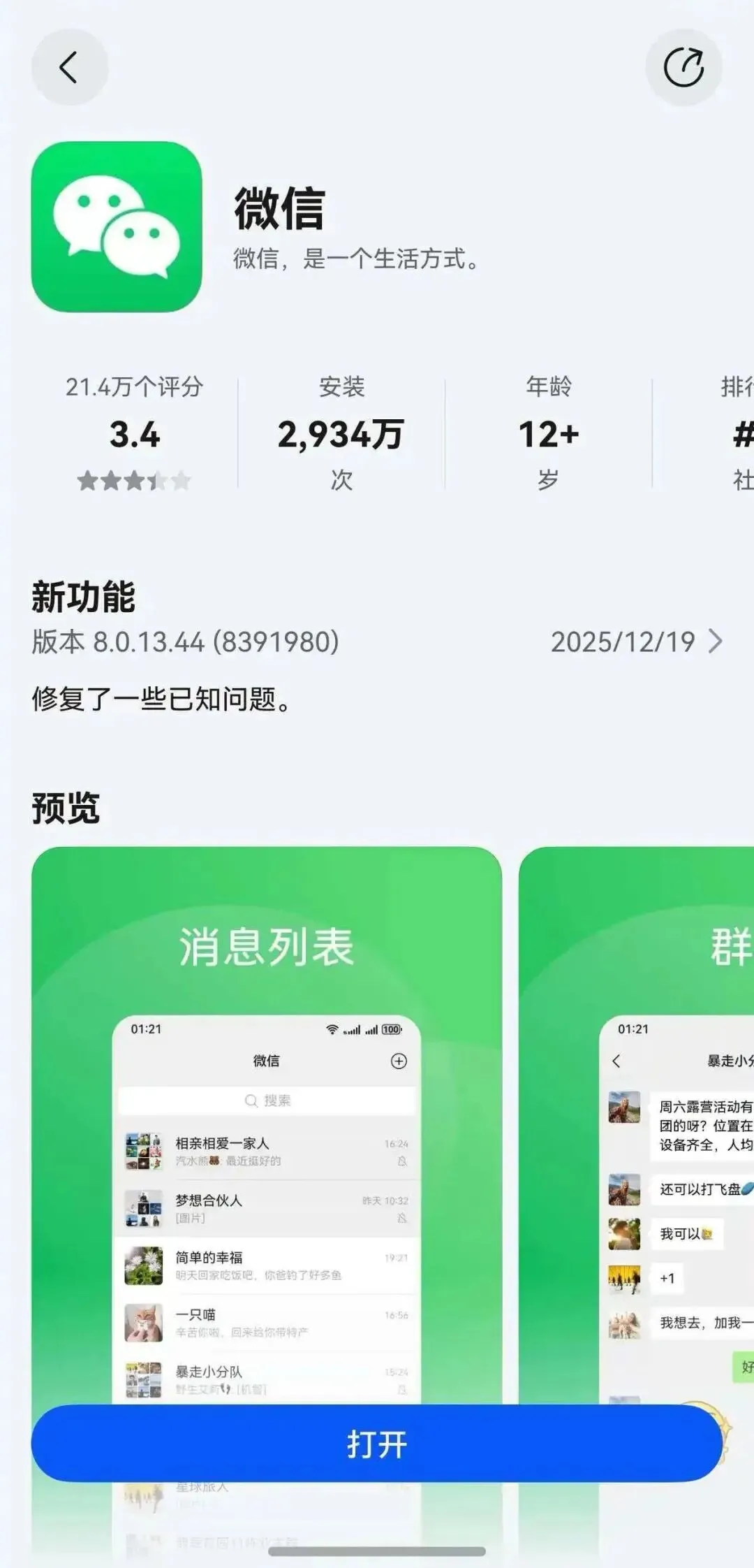 微信团队于 12 月 19 日发布了鸿蒙微信 8.0.13.44(8391980) 正式版。