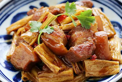 腐竹焖瘦肉、酱香肉末花菜、紫米饭