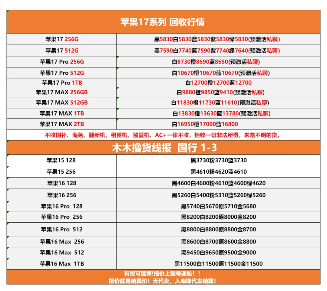 四、酒水行情冷门机型请谨慎下单,容易被反撸!!!报价是市场卖价行情 回收价减10结账我司只接国行正品货源,不组织不参加一切违法违规的活动,拒收所有非法所得的机器。 套取政府补贴,套取消费补贴,AC+、监管机、租赁机、海南版等一系列非法途径获取的一律不要