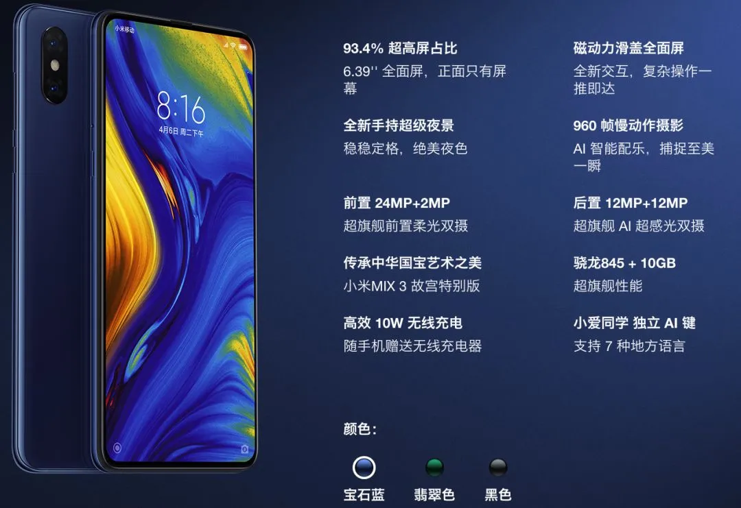 小米 MIX 3 的发售时间是 2018 年 10 月 25 日,当时的配置是骁龙 845 + 无线充电 + 2400 万 + 后置指纹,当时起售价是 3299 元。