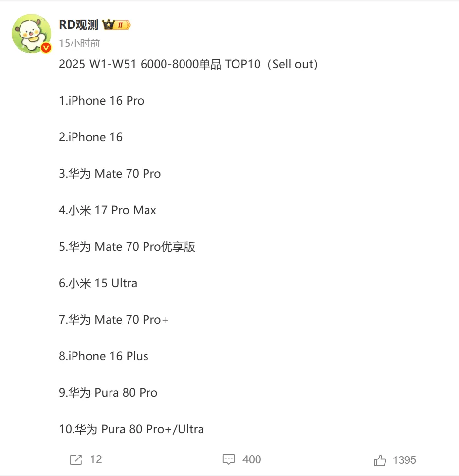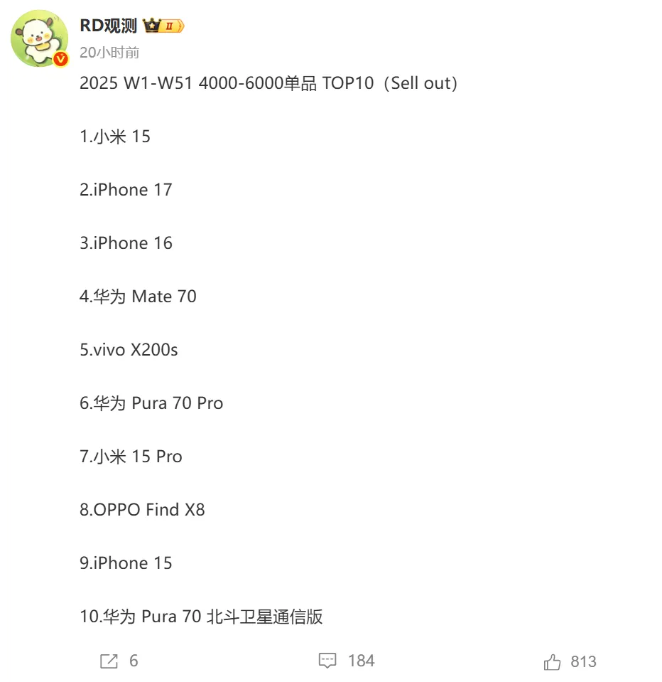 2025年前51周4K-6K 价位段销量榜,小米15成功拿下第一,除了小米15之外,小米15Pro也位居前10。苹果3款机型进入前10,iPhone17和iPhone16则拿下第二和第三,然后iPhone15排名第九。华为这边有3款机型进入前10,分别是mate70、Pura70Pro和Pura70北斗版,然后vivo和OPPO各有一款机型上榜。总体来说,4K-6K价位,苹果和华为依然占据优势,小米稍逊一筹,但在安卓阵营中已经称霸。
