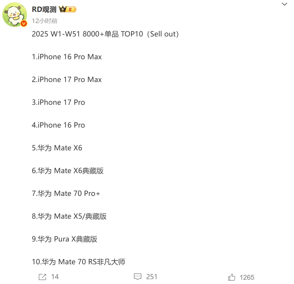 在8K以上超高端市场,格局更为固化,呈现苹果华为二强争霸的局面,安卓则是全军覆灭。2025年前51周国内8K以上超高端市场销量TOP10机型,苹果霸榜前四,其中iPhone16Pro拿下第一,iPhone17Pro第二,iPhone17Pro排名第四。华为虽然排名没有苹果高,但机型数量超越苹果,剩下的6个名额全部被华为包揽,其中Mate X6折叠屏位列第五,成为8K以上价位段销量最高的华为手机。