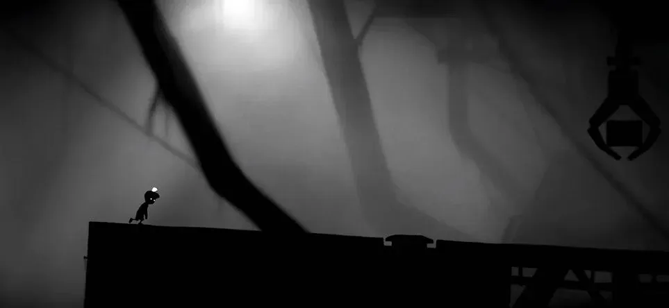 《LIMBO》的成功,首先源于其独树一帜的视觉与听觉设计,这种设计并非单纯的风格选择,而是与游戏主题深度绑定的艺术表达。视觉上,游戏全程采用黑白单色渲染,没有五彩斑斓的色彩点缀,只有浓淡不一的灰阶勾勒出场景轮廓与角色形态。主角小男孩全身漆黑如影,唯有双眼散发着微弱的白色光芒,在幽暗的森林、潮湿的洞穴、轰鸣的工业磨坊中前行,每一步都仿佛踏在现实与幽冥的边界。胶片般的颗粒感、若隐若现的雾气、斑驳的光影杂讯,不仅还原了老式电影的质感,更精准营造出 “地狱边境” 的荒芜与绝望 —— 这种压抑感并非靠血腥恐怖的画面堆砌,而是通过视觉留白让玩家自行脑补,从而产生深入骨髓的心理寒意。听觉设计则进一步强化了这种氛围。游戏没有贯穿始终的背景音乐,取而代之的是风声、脚步声、机关运转的吱呀声、水波的流动声,以及敌人靠近时的细微响动。在极致的静默中,这些环境音被无限放大:小男孩踩在枯枝上的 “咔嚓” 声、远处传来的蜘蛛爬行声、工业齿轮的轰鸣,每一种声音都在暗示危险的临近,让玩家时刻紧绷神经。当追逐战爆发时,急促的音效与环境音交织,瞬间将紧张感拉满;而在空旷的洞穴中,只有水滴声与呼吸声相伴,又能让玩家感受到深入骨髓的孤独。这种 “以静衬动” 的音效设计,让《LIMBO》的世界变得真实可感,也让玩家的沉浸感达到极致。KI4tLrX3uvWq