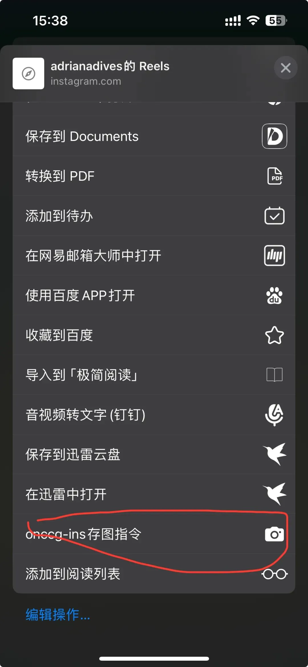 - 在分享菜单中向下滚动,找到 ONCCG-INS 存图指令(如果没看到,点底部的 更多 → 编辑 → 把它拖到前面)。