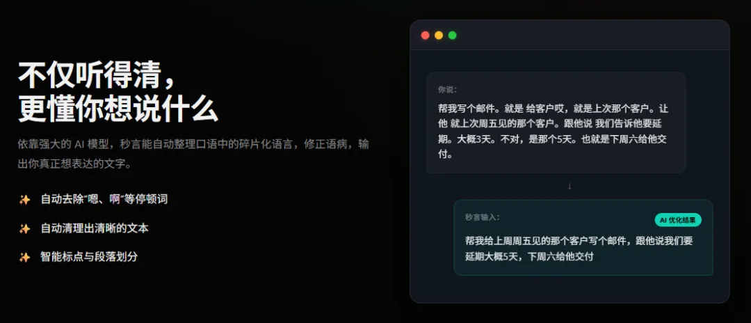 依靠强大的 AI 模型:秒言能自动整理口语中的碎片化语言,修正语病,输出你真正想表达的文字。