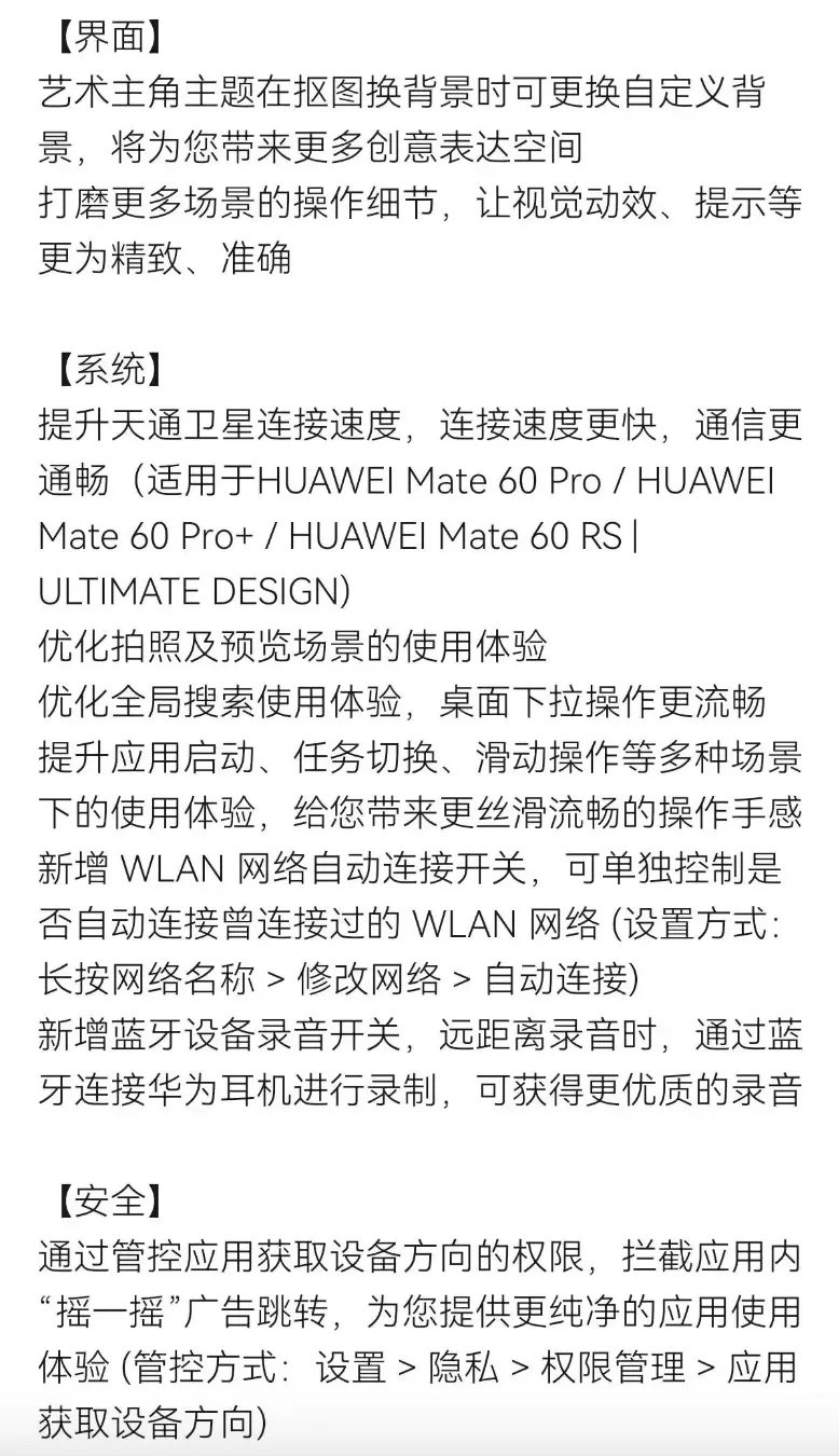 包括特定机型卫星连接速度更快、控制 WIFI 自动连接、拦截“摇一摇”广告、动画更丝滑等等……