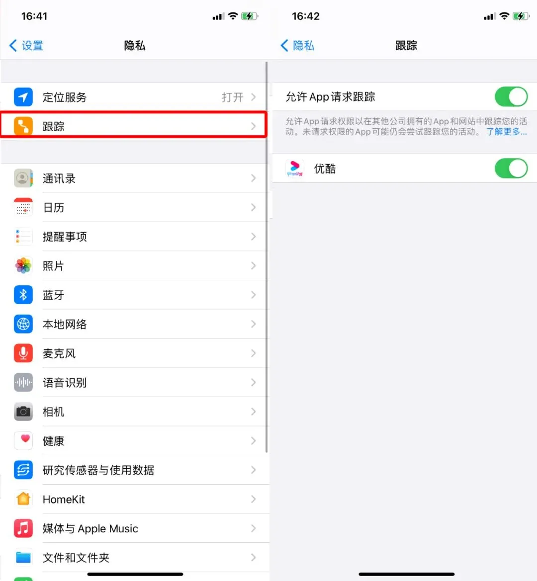 「隐私」中新增「跟踪」功能,可以限制第三方软件对用户数据、信息等方面的收集。