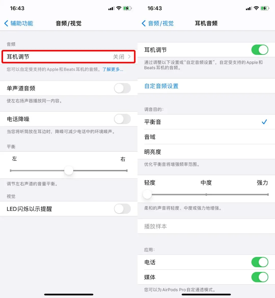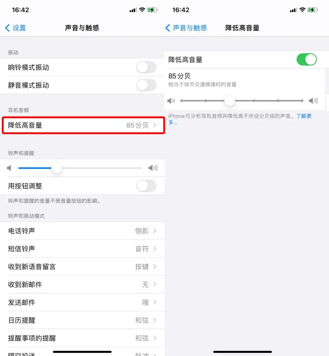 「声音与触感」中新增了「降低高音量」功能,可以分析耳机中的音频并自动降低音量至指定水平,可以有效的保护你的耳朵。