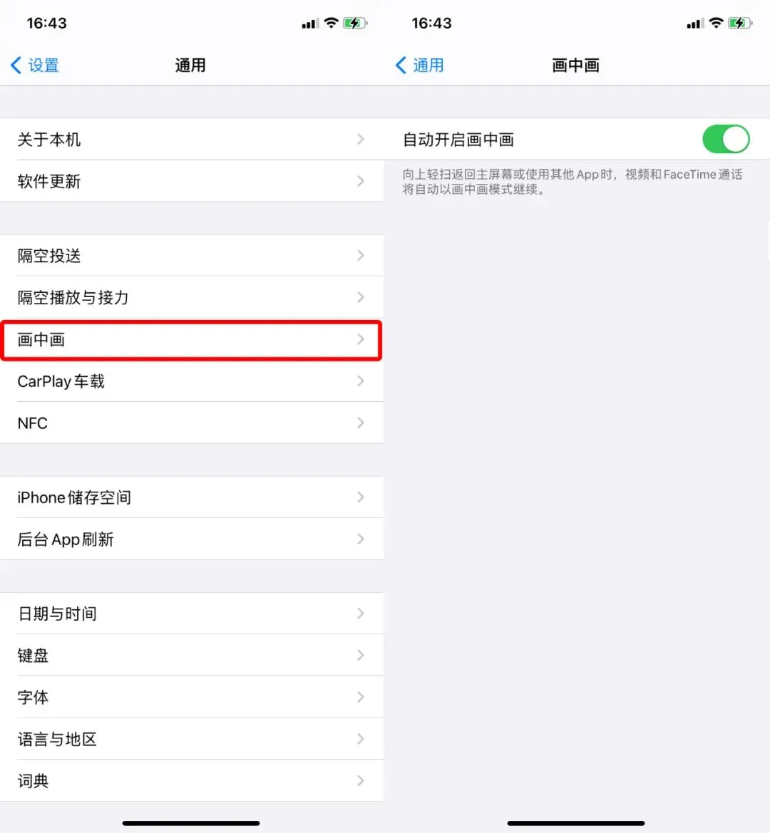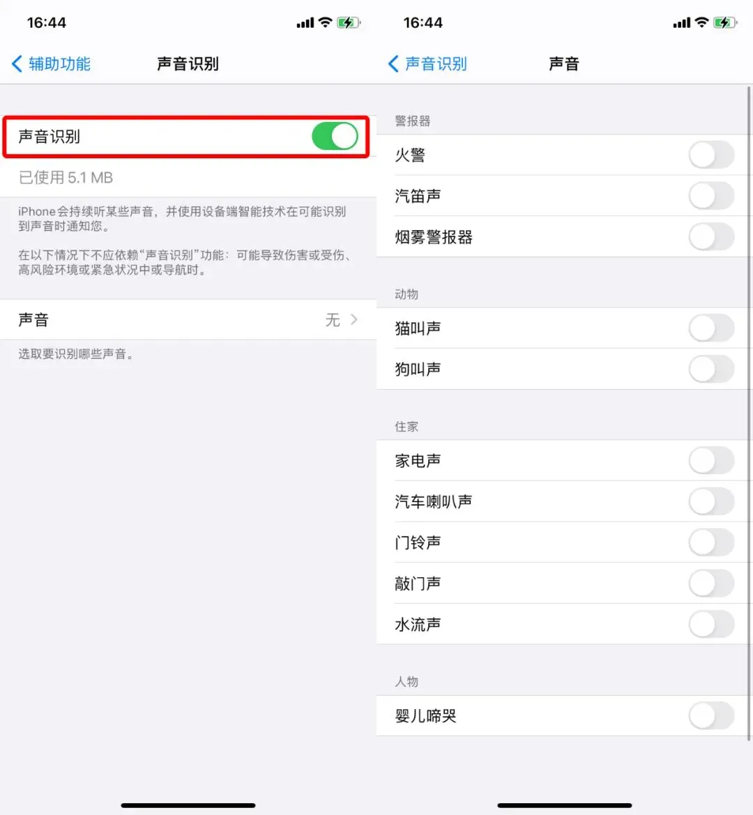 「通用」内新增「画中画」的开关,比如你在看视频的时候突然需要回复微信,那么打开「自动开启画中画」功能后,视频就会自动以画中画的模式继续播放。「辅助功能」内的「音频/视觉 」- 「耳机调节」中新增调音功能,可以调节耳机的音质。「辅助功能」内新增「声音识别」,可以识别动物叫声、警铃、车喇叭等声音并进行提醒。
