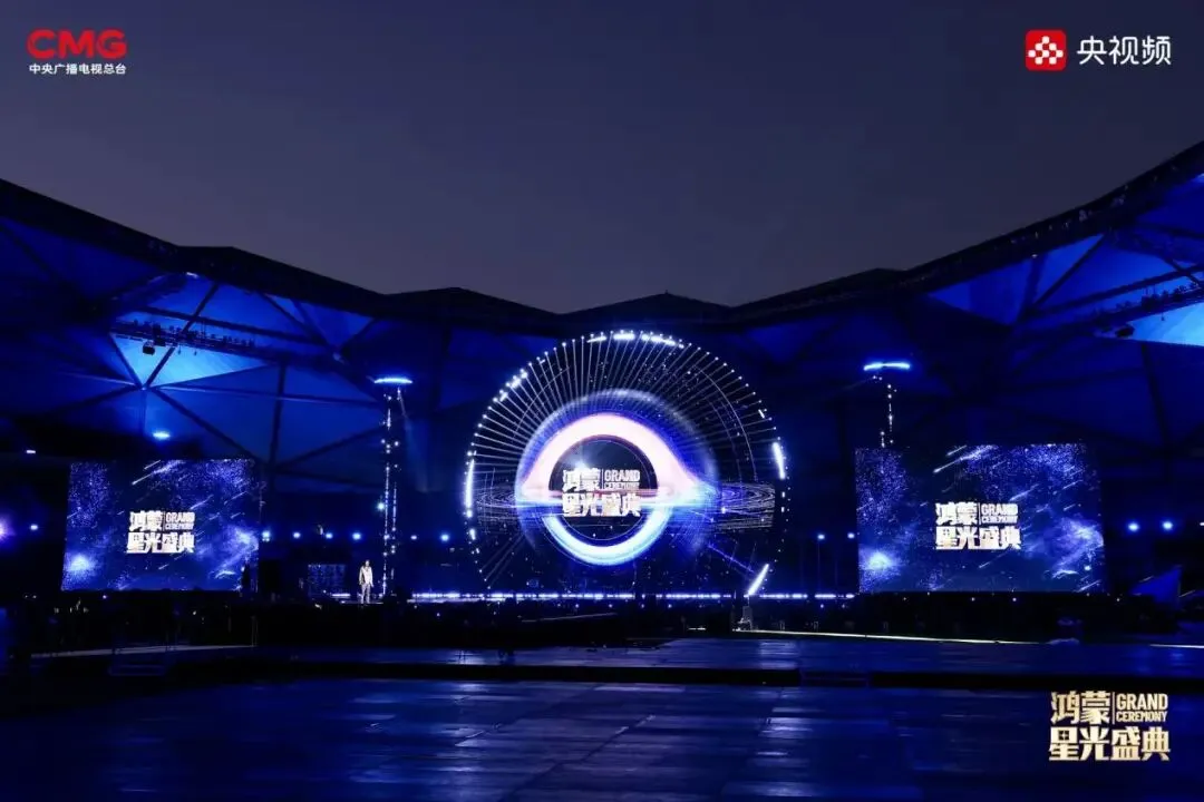 2025年12月20日鸿蒙星光盛典现场——中央广播电视总台演播厅内,穹顶洒下星河般光效,华为展台前,鸿蒙6.0系统界面在巨型屏幕上动态流转:手机、汽车、智慧屏、手表无缝协同。背景板标注“鸿蒙生态设备突破20亿台”,现场观众高举“中国系统,自由无界”应援牌,央视主持人与广东省省长共同点亮“星光之眼”装置。)