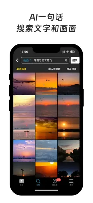2、AI一句话搜索照片:听懂“人话”,不用再纠结于用什么关键词搜索,同时支持搜文字和画面,可以这样搜:“落霞与孤鹜齐飞”、“如何批量删除照片”。