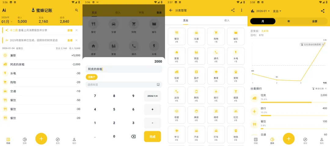 睡眠小乖是款完全免费的睡眠监测、梦话鼾声记录、专业冥想、白噪音播放、睡眠改善、失眠缓解、解压放松的软件,支持安卓、iPhone及Apple Watch设备。这款工具良心免费且功能齐全,适用场景特别丰富,界面简洁优雅,颜值出众。白噪音功能方面,它提供近80种音效,涵盖自然、动物、雨声、场景、城市等类别,可任意搭配4种白噪音,每种音效的音量能单独调节,还能设置定时关闭白噪音播放。它还具备睡眠监测和梦话鼾声记录功能,支持沉浸式监测模式,能让你安稳睡满一整晚,还能记录下每天的睡眠时长、睡眠时段、睡眠中的梦话、呼噜声、其他环境声音、睡眠全程录音以及睡眠评分。蜜蜂记账是一款开源免费的记账工具,支持安卓、iPhone双平台使用,完全免费无需登录注册,离线状态也能正常使用,纯本地存储保障数据安全与隐私,支持自定义云服务及多种云存储方案,数据主权完全归属用户,开发者无法访问任何数据。提供数据导入导出功能,兼容CSV、XLSX、TSV三种格式。它还涵盖超多实用记账功能,包括:多账本管理、多账户统筹、资产管理、账户总览、预算管理与设置、自定义分类预算、收支分类管理、自定义收支分类、收支二级分类设置、账户转账功能、默认支出账户配置、默认收入账户配置、记账备注、记账搜索、记账筛选。另外还支持桌面小组件,能设置个性化主题,支持添加交易图片附件,还有记账提醒、周期记账功能,实用又贴心。