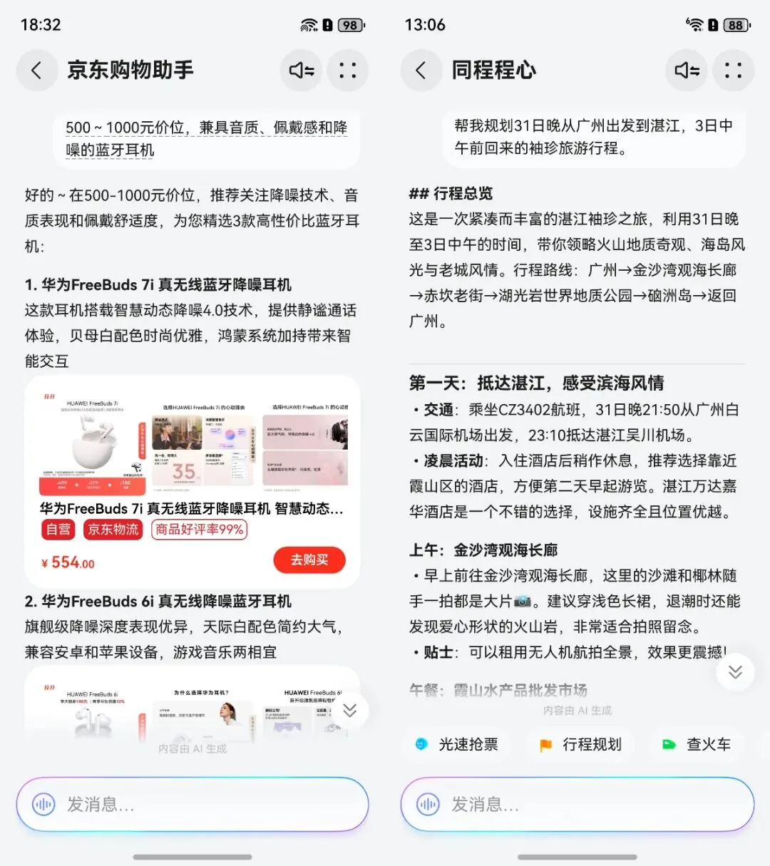 当任务变得复杂,专业的智能体便会登场。想要策划月初的徒步旅行,只需向「同程程心」智能体简单提问,就能获得一份涵盖交通、饮食、装备等方面的专业旅行方案;至于选购商品,则可以咨询「京东购物助手」,它会立刻给出专业的横评对比和产品推荐。这种直接触达服务的方式,省去了在不同 app 间跳转和操作的成本。