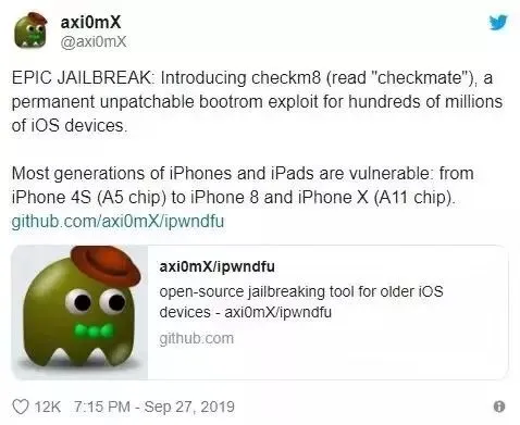 上周咆哥带着大家做了不少 iPhone 相关的评测, 我想同学们对新机也了解的差不多了吧,那么我们今天来看看还有什么新爆料!今天,名为 axi0mx 的安全研究员在某社交平台上透露,苹果出现硬件层面上的漏洞,「iPhone 4S 到 iPhone X 出现无法修复的 Bootrom 漏洞」,同时大多数 iPad 也受到了影响,可利用其随意降级和永久越狱系统。此漏洞名为「Checkm8」,是利用了 iOS 在启动时,加载初始代码中的一个安全漏洞,能用于苹果 Bootrom (只读存储器)固件中,让用户完全获取手机的权限,所以无法通过软件更新来修复。checkm8并非完美越狱,需要每次开机连接电脑引导不过去年苹果已经在 A12 中修复了这个漏洞,iPhone XR、XS、XS Max 以及 iPhone 11 三款新机都不会受到影响。