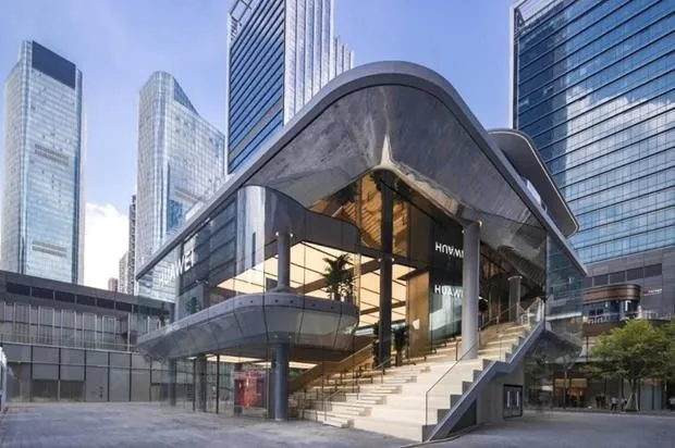 华为全球旗舰店为三层的独栋建筑,以「城市广场」为设计理念,将中国传统的「天圆地方」与西方简约的设计理念融合在一起,外立面采用了大面积高透玻璃,边角采用圆弧设计。内部分为六大区域,分别为产品体验区,公开讲座区,售后服务区,装机区,商务洽谈区及开放社交区,除了可以到店体验华为各类产品,还可以参加 Huawei Community 每天举办的免费课程,主题涵盖摄影、摄像、运动健康等,也可与华为技术专家进行分享交流。