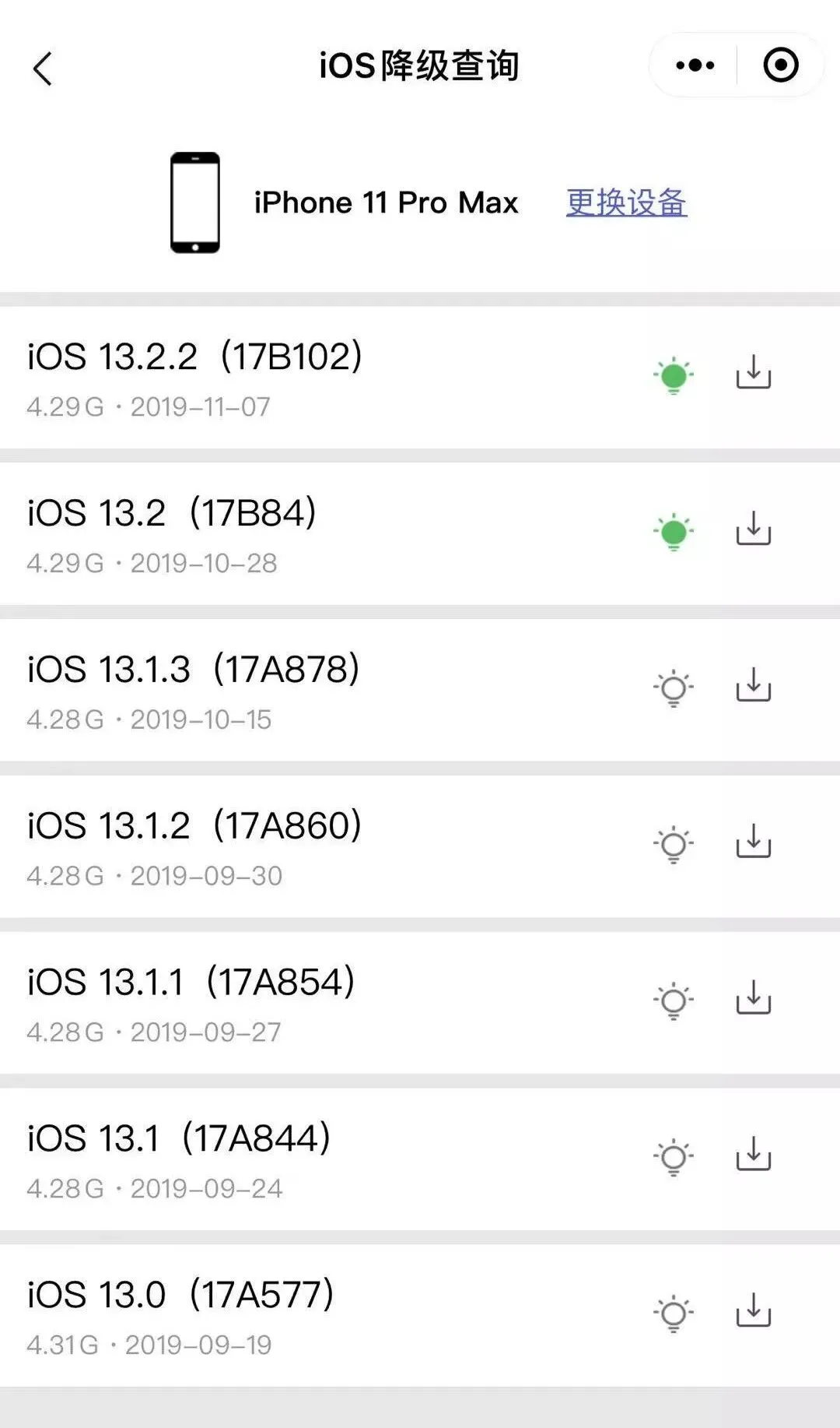 如果担心 OTA 升级出现小问题的话,可以扫描下面小程序码,打开后选择需要升级的系统版本,点右边的下载图标复制链接。
