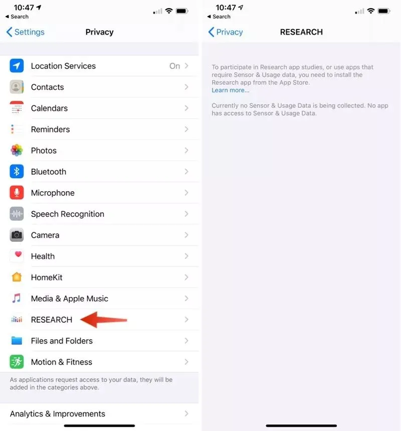 iOS 13.2 在「隐私」部分增加了一个全新的「研究」选项,这部分是为即将发布的研究 App 准备,目前在 AppStore 中还没有发现这个 App,未来能有哪些应用大家拭目以待吧。