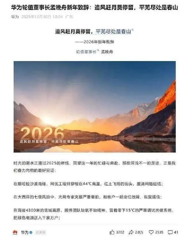 最近刷朋友圈,华为的2026新年致辞直接刷屏。轮值董事长孟晚舟在《追风赶月莫停留,平芜尽处是春山》里甩出硬核战绩:5G-A网络服务6000万用户,鸿蒙5.0设备突破3600万台,智能汽车用乾崑智驾的超140万辆,辅助驾驶跑过70亿公里……数字一串一串,看得我直拍大腿:“这哪是战略,是科技圈核弹啊!”