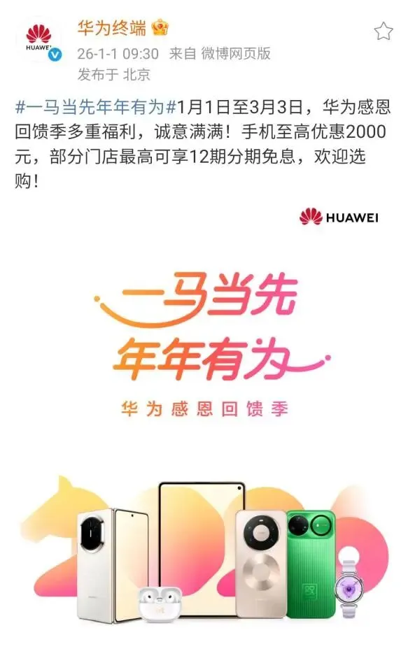 一马当先,年年有为!此次恰逢华为感恩回馈季,多重福利和优惠政策更是让鸿蒙全家桶性价比拉满,活动预计从1月1日一直持续到3月3日。华为的优惠简单直接、诚意十足,覆盖产品、礼品、服务、云服务等多个维度,正是我们入手鸿蒙全家桶的好时机!