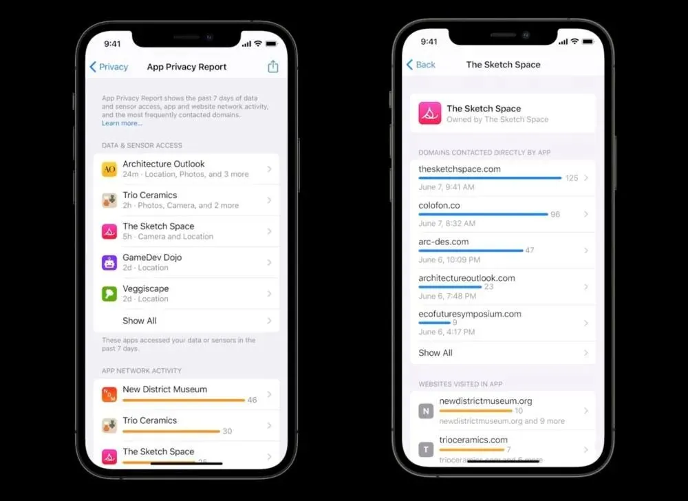 在 iOS15 中,苹果改进了隐私权限的透明化,用户可以直接查看在过去一周时间,哪些 App 使用了你的位置、照片、通讯等敏感数据的信息。