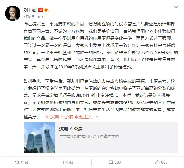 而当年一加早在 2019 年的时候,就在氢 OS 中加入了“禅定模式”。在这个模式之下仅有相机与通话可以使用,即使是重启也不行。不过这个模式是可以设定时间的,后来官方又加入了多人禅定等等。在 iOS15 发布以后,一加手机 COO 刘丰硕也在第一时间做出回应:/图源:微博@刘丰硕