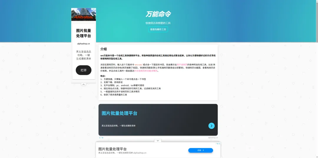 万能命令是一个在线工具效率平台,将各种高质量的在线工具按应用站点聚合起来,让你以方便快捷好记的方式寻找和使用各类在线工具。