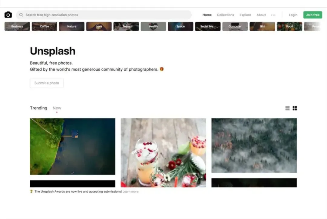 UnSplash 是一个免费的无版权图片网站,图片是由世界各地的用户提供上传的,在互联网上可自由使用,无论是商业还是非商业,无需经过允许即可任意使用,都不需要付费。