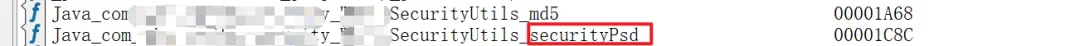 v11 = (*env)->FindClass(env, "com/SecurityUtils");v18 = (*env)->GetStaticMethodID(env, v11, "securityPsd", "(Ljava/lang/String;Ljava/lang/String;)Ljava/lang/String;");