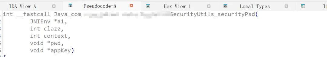 根据之前安卓逆向案例1将的原理,a1修改为JNIEnv* env,a2改为clazz, 后面3个参数根据对应java层的securityPsd修改