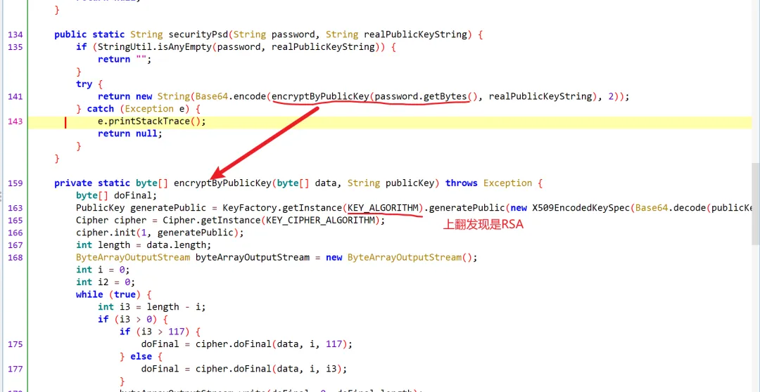 能看到使用了X509EncodedKeySpec对象,且KeyFactory.getInstance(KEY ALGORITHM) 中KEY ALGORITHM是RSA,符合RSA的加密流程