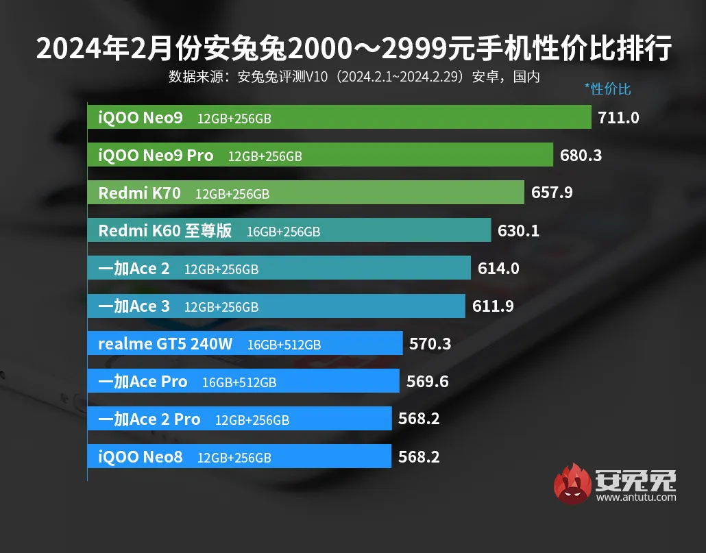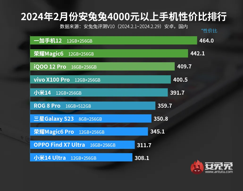 这里是给大家按价位节选的2月性价比榜单内容,有兴趣的朋友可以搜索安兔兔官网或点击https://antutu.com/ranking/rank2.htm查看完整榜单。