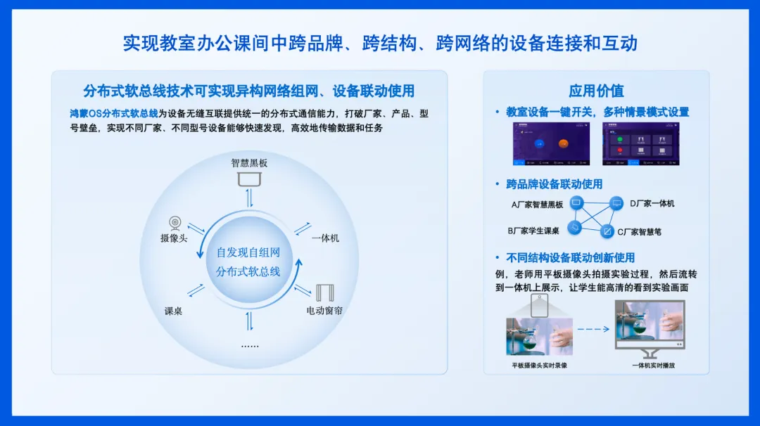 鸿蒙OS的分布式软总线技术是实现教室设备智能联动的关键。它打破了传统教室中跨品牌、跨结构、跨网络的设备壁垒,实现了设备间的无缝连接和高效协同。