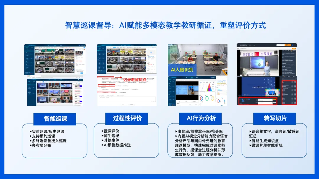 多模态教学教研:方案支持多模态教学教研,通过人脸识别、行为分析等技术生成课堂画像,为教师提供客观、量化的教学评价数据,助力教学优化。