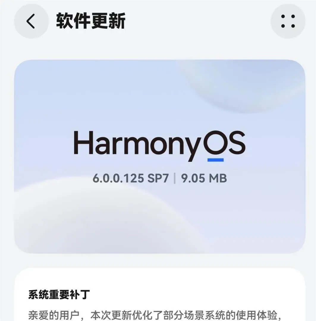与此同时,一些细微但关键的补丁包也在陆续推送。 例如,HarmonyOS 6.0.0.120版本用户最近接收到了一个约230MB的补丁包,而Mate 80系列则收到了仅9MB的HarmonyOS 6.0.0.125 SP7补丁,专门优化特定场景下的使用体验。