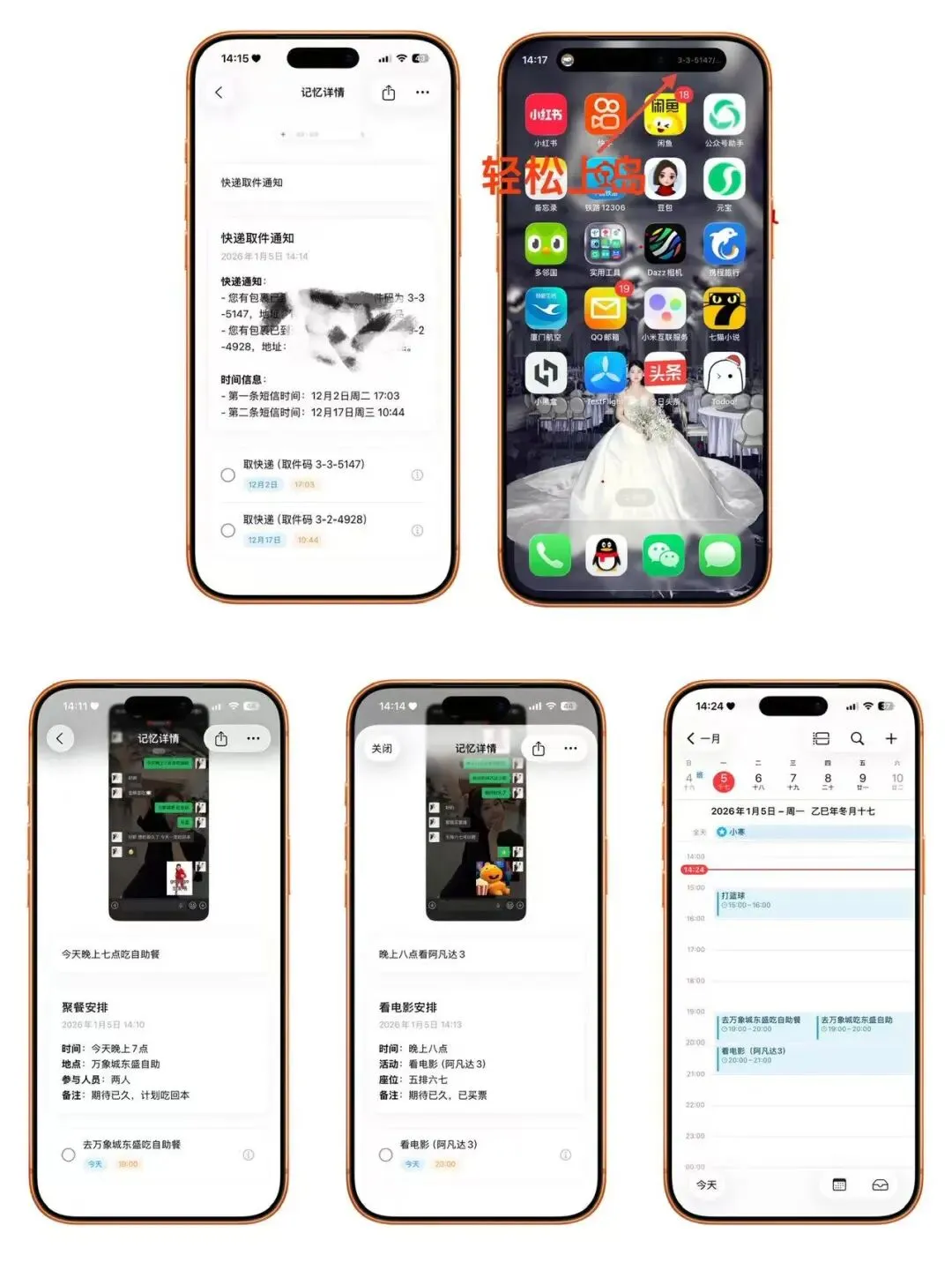 核心优势直击痛点:无需复杂操作,按下操作按钮即可触发AI 智能识别 —— 微信约饭的时间地点、电影票的场次座位、快递取件码,甚至多轮对话中修改后的日程,都能精准提取并自动同步至日历,默认 15 分钟 + 正点双重提醒,避免遗漏。刷到优质笔记或重要资料时,一键触发即可完成内容解析与存储,支持灵动岛悬浮展示,切换 App 后仍能随时返回补充编辑,多任务处理更流畅。