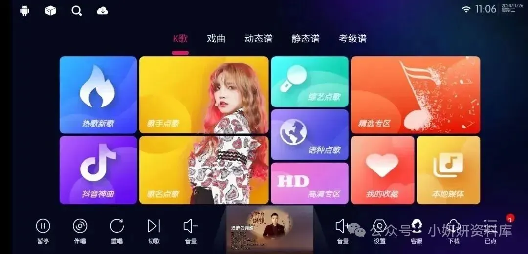专门给电视设计的免费K歌软件,歌单超全,流行、经典、民谣、摇滚都有,连京剧这类戏曲资源也能找到。点歌方式特别灵活,综艺热歌、抖音神曲、按歌手或歌名搜都可以,还支持动态谱、静态谱、考级谱,高清专区的音质也很棒,能收藏喜欢的歌,也能读取本地音乐。