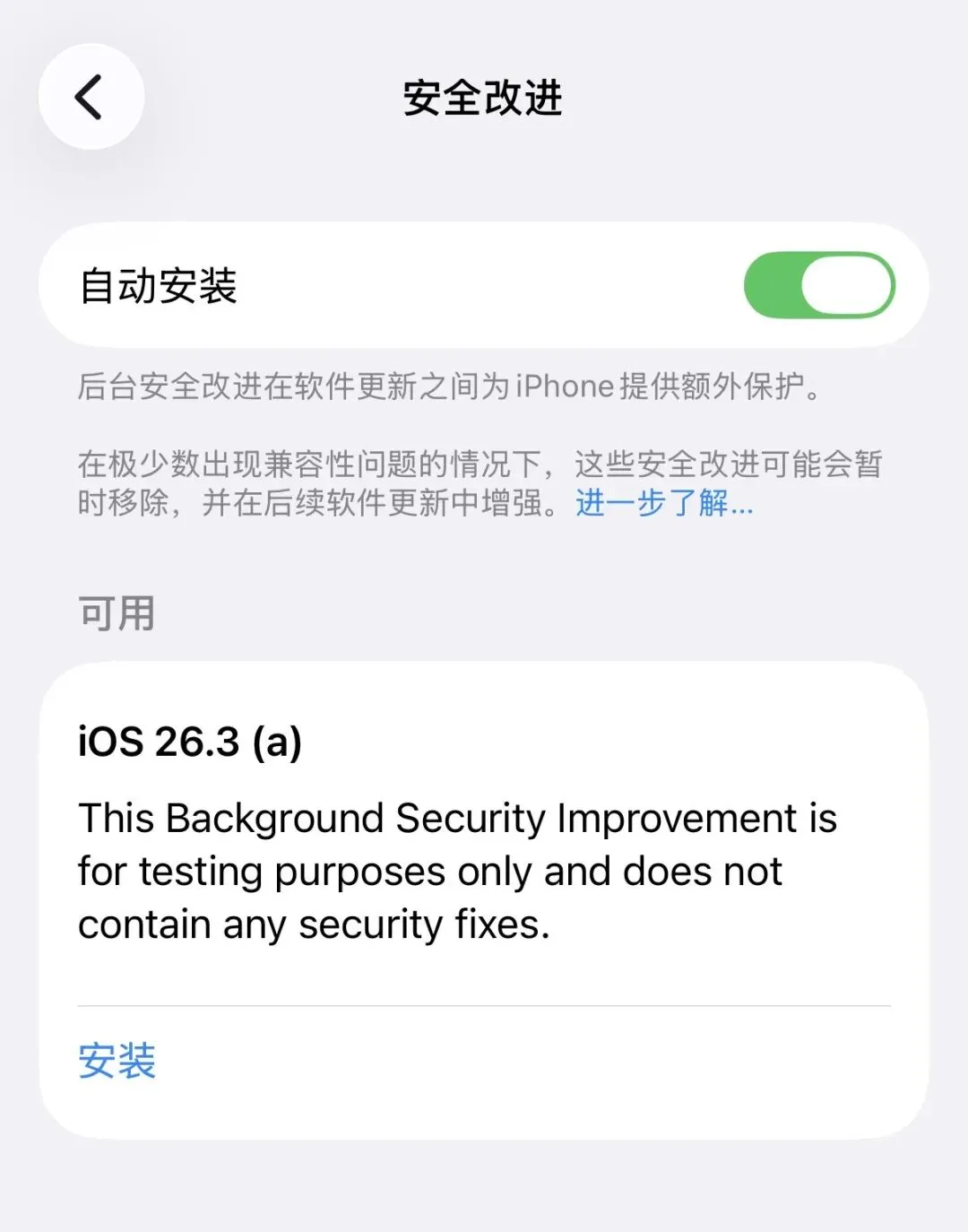 iOS 26.3(a)的话,在关于本机的 iOS 版本页面会